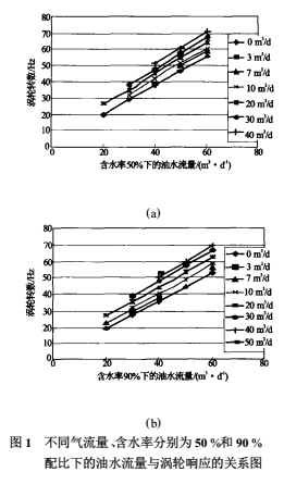 圖1中分別給出了不同氣流量、油水兩相含水率分別為50%和90%下的油水總流量與渦輪響應(yīng)的關(guān)系。