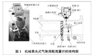 如圖1,機械表頭式的氣體渦輪流量計主要由殼體、導流器、機心組件、計數器組件(表頭)、潤滑系統、智能體積修正儀(可選)幾部分組成。