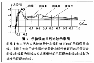 從專業技術角度來說,電子表頭式渦輪流量計一般由于無法有效降低儀表內部阻力,不經修正的示值誤差曲線多處(多段)超差,只有通過將儀表流量分為幾段采用不同的儀表系數進行非線性修正,才能使它達到合格示值誤差曲線的要求。機械表頭式渦輪流量計的示值誤差曲線完全由儀表的結構設計技術水平、零部件制造水平、裝配工藝水平、整機測試水平來決定,不存在非線性修正的問題。示值誤差曲線比較如圖3所示。
