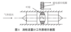 1、渦輪流量計的測量原理渦輪流量計是一種速度式流量儀表,測量本體是渦輪流量傳感器,主要由葉輪和磁電感應線圈組成,葉輪軸心與管道中心相同,可以自由轉動,其葉片與氣體流動方向成一定角度。在流體沖擊下,渦輪沿管道軸向旋轉,其旋轉速率隨流量變化而不同,流速越高,動能越大,渦輪的轉速也越高。渦輪的轉速經磁電感應轉換器轉換為相應頻率的電脈沖,通過顯示儀表進行積算和顯示(圖1)。