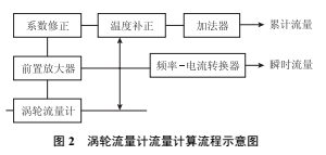 渦輪流量計通過不同的計算方法,可分別顯示累計流量和瞬時流量。當渦輪葉片切割殼體內永久磁鋼產生的磁力線時,將引起傳感線圈磁通的變化,磁通周期變化信號經前置放大器放大、整形,產生與流速成正比的脈沖信號,脈沖信號經流量積算電路換算后顯示累積流量值,同時經頻率電流轉換電路轉換成模擬電流量,進而顯示瞬時流量值(圖 2)。