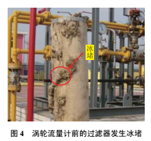 通過逐項排查,發現流量計前面的過濾器和流量計后的調壓裝置存在一定程度的冰堵(圖4)。采取管道排污、輔助加熱、清洗過濾器及調低流量計入口壓力至4.0MPa等措施,改善了天然氣的節流效應,使渦輪流量計能夠正常運行。經與下游門站渦輪流量計比對,輸差控制在有效范圍。