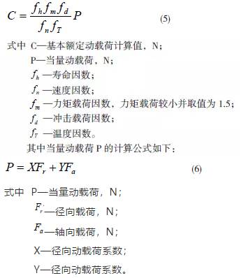 將選型軸承的參數(shù)代入(5)、(6)中直接得出基本額定動載荷C,而選型軸承的動載荷Cr 必須大于基本額定動載荷C 才能滿足設計要求。