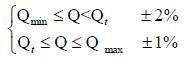 由圖2 可見,儀表系數(shù)可分為二段,即線性段和非線性段。在非線性段, 實際特性受軸承摩擦力、流體粘性阻力影響較大。當流量低于Qmin 時,儀表系數(shù)隨著流量迅速變化。壓力損失與流量的平方成正比關(guān)系。通常線性段約為工作段的2/3,其特性與渦輪結(jié)構(gòu)參數(shù)及流體粘性有關(guān)。隨流量的變化其儀表系數(shù)K 也會有一定的變化,但變化不大,通常將其變化幅度稱為流量計的計量準確度。對于產(chǎn)品設計而言,期望能將線性段的流量范圍拓展,一臺流量計能覆蓋同口徑的不同流量范圍,使得產(chǎn)品量程比變寬從而降低生產(chǎn)管理與生產(chǎn)批量加工成本。對于1.0 級的高壓智能一體化氣體渦輪流量計,以Qt(0.2Qmax)為分界流量點,將計量線性分為兩段,其中一段的*大允許誤差為±2%,而另一段的*大允許誤差為±1% 。按圖2 所示,通常每臺渦輪流量計均有較為相似特性曲線,若將可測量流量范圍做寬,就能在同口徑不同流量范圍進行分段截取,以實現(xiàn)一臺流量計能覆蓋同口徑的不同流量范圍。