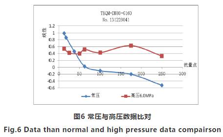為了確認高壓渦輪流量計在高壓氣體介質(zhì)中計量性能是否滿足工業(yè)貿(mào)易計量要求,將多臺DN80-G160 樣機發(fā)往*三方檢測機構(gòu)**石油天然氣大流量計量站南京分站進行6 MPa 實流檢定;檢定合格,準確度等級為1.0 級,相對于常壓檢定數(shù)據(jù)樣機的儀表系數(shù)K 有所偏移,但仍在允許誤差范圍內(nèi)。其中南京分站使用小流量標準裝置對編號為131228041 的DN80 渦輪流量計進行檢定,該樣機在常壓與高壓檢定比對數(shù)據(jù)如圖6 所示。而流量計的儀表系數(shù)K 的計算如下: