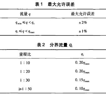 在GB21391—2008《用法蘭連接渦輪流量計測量天然氣流量》對分界流量有明確的定義,即低于該流量要采用擴展誤差限的流量值。標準*5.2條從*大允許誤差和量程比兩方面對分界流量做出了規定,且明確了量程比是在*大允許誤差范圍內流量計的*小流量和*大流量之比。該標準中對渦輪流量計要求的*大允許誤差如表1所示,量程比與分界流量9,的關系如表2所示。