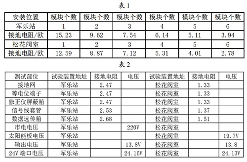 接地網(wǎng)的安裝與連接:接地網(wǎng)是整個菜籽油流量計防雷試驗比較關(guān)鍵的一個內(nèi)容,能不能準確的論證試驗的有效性,必須保證接地網(wǎng)達到標準的接地電阻,通過對實地地電阻率的測試,初步選擇6個接地模塊埋設(shè)并配用降阻劑使用,邊安裝邊測試直到達到標準值后才引入等電位箱。在軍樂站和松花閥室安裝模塊并測試數(shù)據(jù)見表1。