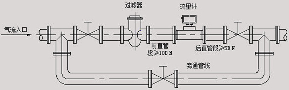 4、為了檢修時(shí)不至影響液體的正常輸送,應(yīng)在傳感器兩端的直管段外安裝旁通管道(如圖四);