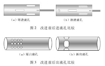 防砂卡防爆渦輪流量計結構如圖1所示,主要由防爆渦輪流量計、篩狀出液孔、防爆渦輪流量計安裝短接、解卡管、解卡管開槽、中心管、長條孔(銷釘運動槽7)、薄壁筒、進液孔、解卡管固定銷釘、含水傳感器安裝筒組成。采用等效面法,將進液孔一分為二,改為寬2mm的矩形進液孔,解決從進液孔進入的長垢片或大垢片造成的砂卡,如圖2所示。將原先3個方型的出液孔改為直徑4mm的陣列狀的篩孔,解決儀器在下井過程中從出液孔進入儀器的長垢片、大垢片造成的砂卡,如圖3所示。