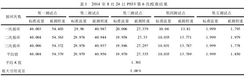 表1為2014年8月24日P033*6次校準結果。本次校準平均K值1.301r/(m3?s),大于1.0r/(m3?s),同時*大引用誤差為1.08%,小于*大允許誤差3%,啟動排量2m2/d時的平均轉速1.850r/s,因此P033校準合格。同樣,P032、K001、K018先后校準合格。因此,在啟動排量、*大允許誤差合格的前提下,K值大于等于1,K值可以評價解卡管、進液孔、出液孔造成的局部阻力損失。