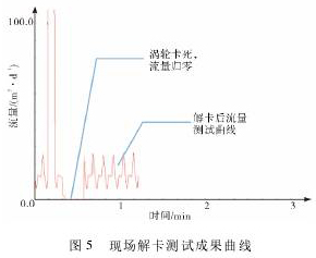 防砂卡防爆渦輪流量計在五大隊成功解卡370井次,現場解卡測試曲線見圖5。剛測試時,渦輪葉片轉動正常,大約在20s左右,由于流體帶進的雜質導致流量曲線歸零。通過儀器二芯供電收傘,大約15s后再開傘,一芯流量供電測試,渦輪葉片通過瞬間開收傘,擴大了葉輪與渦輪殼體之間的空間,雜質通過渦輪葉片旋轉正常。從曲線可以看出,在解卡前和解卡后,渦輪旋轉--致,都為15m3/d左右,而且解卡前后沖次一致,防爆渦輪流量計解卡裝置有效解決了因油井出砂、垢片、間隙小造成的砂卡,砂卡率由原先的70%降低到30%,實現了產液剖面流量準確測試。