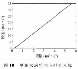 為了驗證切向渦輪在單相流體中的響應情況,在全集流條件下對其在單相水及單相油介質(zhì)中響應規(guī)律進行了研究。對于單相水的渦輪響應情況,進行了在0~6m3/d流速范圍內(nèi)的渦輪響應實驗,測得單相水介質(zhì)中渦輪的啟動排量為0.081m3/d,渦輪響應情況見圖10。經(jīng)過擬合后的響應關系為ω=6.49Q-1.446。