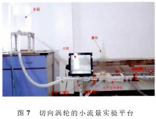 為了驗證仿真的準確性,通過室內(nèi)實驗對其驗證。切向渦輪采用可視化研究平臺,整個渦輪的結(jié)構(gòu)都采用亞克力板雕刻組裝而成。如圖7所示,水箱主要提供穩(wěn)定水壓,水平切向渦輪做成開口系統(tǒng)并放置在實驗支撐架上,前置閥門可控制水流,在需要更換切向渦輪的零件時可關閉,控制閥門主要是控制流經(jīng)切向渦輪的流量,流量測量仍采用傳統(tǒng)可靠的容積時間法。實驗時以染色劑作為示蹤劑,以觀察流場的分布情況。