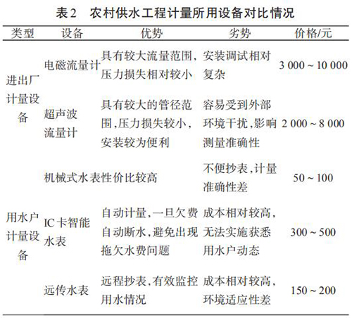 從現階段來看,農村供水工程進出廠水計量設備主要采取的為液氧流量計、超聲波流量計,而用水戶計量設備主要包括機械式水表、IC卡智能水表、遠傳水表等。這些設備在實際使用過程中都有自身的優缺點,同時在價格方面存在較大差異,其具體情況如表2所示。
