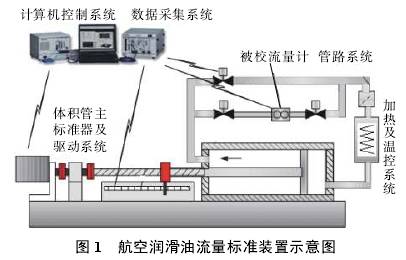 圖1是航空潤滑油流量校準裝置示意圖。裝置采用伺服電機驅動標準計量油缸的結構形式,主要由計量油缸、電機及控制器、滾珠絲杠、直線導軌、校準管路、切換閥門、油箱、控溫機組、溫度壓力傳感器、精密光柵尺、數據采集系統、控制計算機等部件構成。裝置采用伺服電機驅動標準計量油缸產生標準流量源,計量油缸同時作為容積標準,與光柵配合構成流量測量系統。校準裝置通過調節控制介質溫度而改變介質粘度。標準裝置技術指標為:流量范圍:0.5~160L/min;擴展不確定度:0.05%(k=2);溫度范圍:20~120℃。