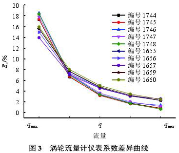 由圖2可知,不同粘度點下流量計儀表系數差異很大,圖3是10支流量計各流量點儀表系數誤差曲線。儀表系數差異通過式(1)計算。結果顯示,在低流量點儀表系數*大相差18%以上,在高流量點儀表系數*小相差約1%。