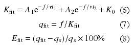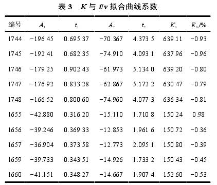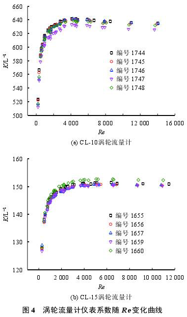 利用雙指數衰減函數對儀表系數與雷諾數關系進行擬合,在層流范圍內(Re<2300),儀表系數隨Re增加迅速增加,尤其是在Re<1000范圍內更加明顯;而在Re>3000紊流范圍內,儀表系數變化平緩,接近常數;在10003000的穩定儀表系數。
