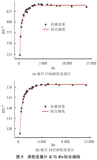 利用雙指數衰減函數對儀表系數與雷諾數關系進行擬合,在層流范圍內(Re<2300),儀表系數隨Re增加迅速增加,尤其是在Re<1000范圍內更加明顯;而在Re>3000紊流范圍內,儀表系數變化平緩,接近常數;在1000
