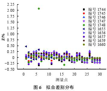 選取與以上要求的9個關鍵雷諾數相近的流量點數據進行擬合,并與全數據擬合結果進行比較,兩者差別通過式(9)進行評估。圖6是兩種擬合方式差別分布情況。300對數據點中,僅有1點儀表系數差別超過2%,其他各點差別均小于0.5%,而且99%以上的數據點差別小于±0.33%,86%以上的數據點差別小于±0.20%。