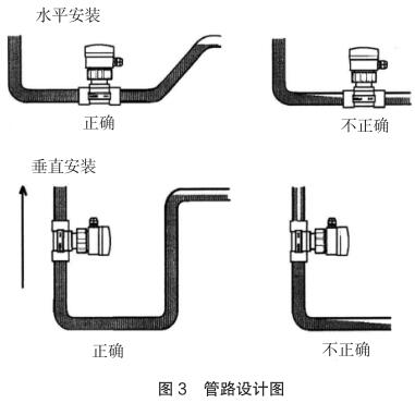 現(xiàn)場安裝時應(yīng)注意遠(yuǎn)離可能對其產(chǎn)生干擾的大型設(shè)備,防止長期的熱輻射和其他如磁場直射等環(huán)境影響。為確保高測量精度和較好的零點穩(wěn)定性,進(jìn)行校正前,防凍液流量表應(yīng)裝入工藝介質(zhì)中至少 24 小時電*鈍化。安裝的管路設(shè)計應(yīng)確保管道始終充滿流體,防止測量誤差,管路設(shè)計圖見圖 3。