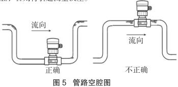 測量流向取決于防凍液流量表的安裝方位,將防凍液流量表在接頭上旋轉(zhuǎn) 180 度即可反向。正流向時,防凍液流量表的突耳應(yīng)在上游方向。流量顯示總是正的,而累加器可以根據(jù)流向增加或者減少。安裝中確認(rèn)管路設(shè)計不允許在介質(zhì)中產(chǎn)生氣泡或空腔,否則將引起測量誤差(見圖 5)。