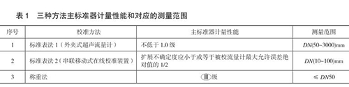 本規范包含三種校準方法,分別為標準表法 1(外夾式超聲流量計)、標準表法 2(串聯移動式在線校準裝置)和稱重法,編制組對每種方法進行了大量的實驗,并積*與熱水流量計生產廠家及用戶溝通探討,積累了豐富的經驗,獲得了大量的實驗數據,*終確定三種方法的主標準器計量性能和對應的測量范圍,如表 1 所示。