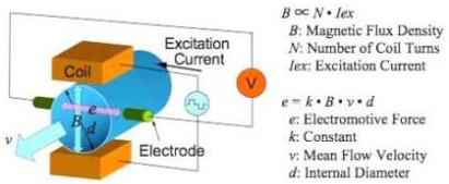 基本上,當導電液體流過磁場時,會感應出電壓。為了測量該產生的電壓(與流動的液體的速度成正比),使用了兩個彼此相對安裝的不銹鋼電*。