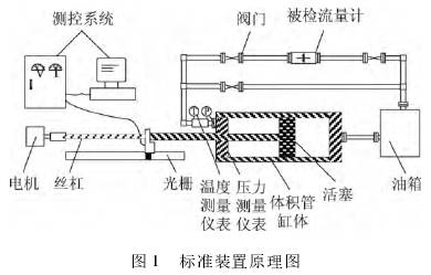 燃油動態流量標準裝置的工作原理為:工作過程中電機旋轉,驅動滾珠絲杠帶動標準體積管活塞左行,排出液體流經控制閥門及被檢流量計后,經過過濾器回到儲油箱;同時,儲油箱里的油經過下游管段進入標準體積管。
