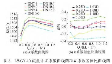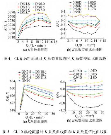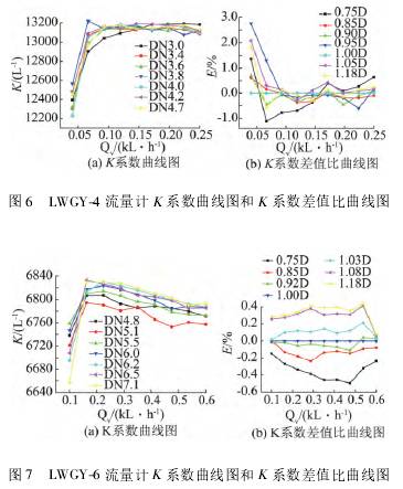 圖3~圖8分別為流量計的K系數曲線圖和無量綱化后的差值比曲線圖。