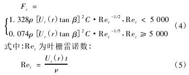 式中:Cl和Cd為葉柵的升力系數和阻力系數,二者可通過不可壓縮勢流的方法計算,與葉片翼型、葉輪轉速、來流速度和半徑位置等參數相關。