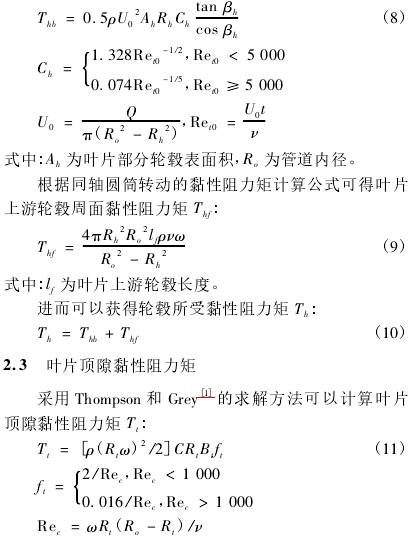 式中:Td為葉片驅動力矩;Th為輪轂周邊黏性阻力矩;Tt為葉片頂隙黏性阻力矩;Tw為輪轂端面黏性阻力矩;Tb為軸承黏性阻力矩;Tm為軸與軸尖機械阻力矩