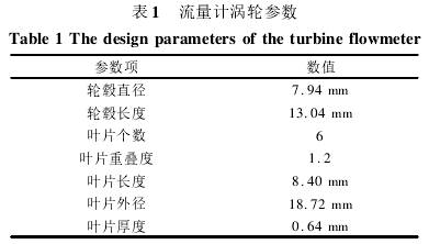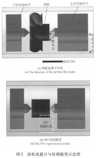 實驗在中國科大水平循環水實驗平臺上進行,實驗采用20mm口徑的柴油計量表,量程范圍是1~80方/天,其中較好線性段范圍是5~50方/天,流量計渦輪為等重疊度渦輪(不同半徑位置葉柵重疊度相同),具體參數如表1所示,這種流量計在大慶油田的生產測井中廣泛應用,其結構如圖2(a)所示。來流經過一段導流葉片整流后進入渦輪的環空空間,驅動葉輪轉動,輸出響應信號。在柴油計量表的線性響應區間中,處于穩定轉動時渦輪葉片對流體的干擾較少,相對來流攻角較小,對流體的軸向速度分布基本沒有影響,僅會稍稍增加其周向轉速。因而為了測量柴油計量表入口速度分布,特別制作了各參數與實際渦輪相同但并無葉片的透明外殼輪轂模型,如圖2(b)所示,通過PIV手段,對管道中軸面上輪轂和管壁之間的區域的軸向速度分布進行剖面測量。輪轂模型安裝在待測柴油計量表的上游,相距超過2m以保證二者之間無相互干擾。實驗流速范圍在5~25方/天,在管路下游采用時間-質量法獲得真實流速,通過光學觀測獲得柴油計量表葉輪的真實轉動頻率,同時采用PIV技術測量輪轂模型中的速度分布。
