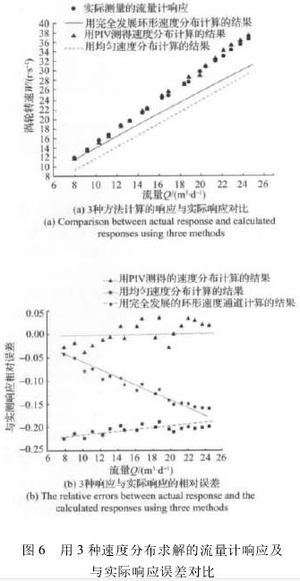 分別計算各個響應在不同流量點處與真實響應的相對誤差,結果如圖6(b)所示。從圖中可以明顯看出,用PIV獲得的速度分布計算的結果與實際響應的相對誤差*小,在3%以內;用均勻入口速度分布計算的結果誤差*大;用完全發展的環形通道速度分布當雷諾數超過2000時,由于計算模型假設由層流的速度分布直接轉變為湍流的速度分布模型,未能合理地反映實際流動中逐步轉變的過渡階段,導致理論結果與實際速度分布有較大差異,所以誤差較大。通過這些對比不難看出,獲得真實的速度分布能更為準確地計算柴油計量表的實際響應。面對復雜的上游來流條件,PIV結果更能反映柴油計量表內部流動的主要特征,這也從另一個側面表明,對柴油計量表內部復雜流動的精細測量和深入認識也將是完善相關理論和進一步優化其性能的重要途徑。