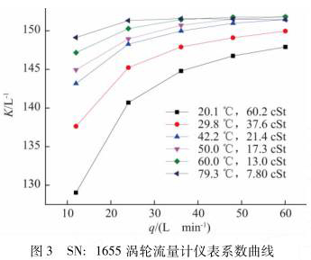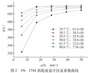 利用航空潤(rùn)滑油流量標(biāo)準(zhǔn)裝置在20,30,40,50,60,80℃下分別對(duì)4支熱水計(jì)量表進(jìn)行校準(zhǔn)試驗(yàn)。流量計(jì)校準(zhǔn)流量點(diǎn)分別為6,17,28,39,50L/min;流量計(jì)校準(zhǔn)流量點(diǎn)分別為12,24,36,48,60L/min。圖2和圖3分別是SN:1744和SN:1655兩支熱水計(jì)量表在各溫度點(diǎn)儀表系數(shù)K隨流量q變化曲線,從中可以看出,不同溫度點(diǎn)下流量計(jì)儀表系數(shù)差異很大。