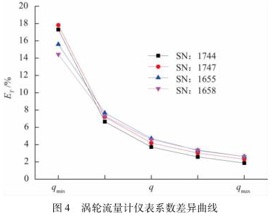 4支流量計(jì)各流量點(diǎn)q下儀表系數(shù)誤差ET曲線如圖4所示。