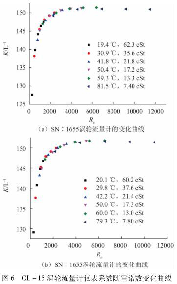 熱水計(jì)量表不同溫度點(diǎn)儀表系數(shù)差異很大,主要原因是溫度改變導(dǎo)致航空潤(rùn)滑油粘度改變。校準(zhǔn)結(jié)果中儀表系數(shù)隨流量變化曲線未體現(xiàn)滑油粘度對(duì)熱水計(jì)量表的影響,流量計(jì)儀表系數(shù)K隨雷諾數(shù)的變化曲線如圖5和圖6所示。同一支流量計(jì)在雷諾數(shù)相近的情況下,其對(duì)應(yīng)的儀表系數(shù)很接近,儀表系數(shù)是雷諾數(shù)的單值函數(shù)。雷諾數(shù)Re關(guān)系式為