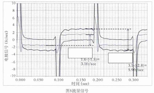 舉例,如圖5所示,線圈采用5Hz驅動時的0feet/s,3.1feet/s,5.9feet/s流速下的電*信號,利用上述方法對信號進行處理并計算流速。取每半波*后的20%納入流速計算,正半波與負半波相減即是流速。如3.1feet/s–(-2.8feet/s)=5.9feet/s,雖然有+0.15 feet/s的直流偏置,但也不影響流速的計算。因線圈是5Hz驅動,半波的20%是20ms,正好是1個完整的工頻周期,這樣就不受工頻干擾的影響。正半波與負半波相減,這樣就避免了直流偏置和共模干擾的影響。再加上在數字濾波過程中使用限幅濾波和算數平均,保證了流量信號的有效提取。