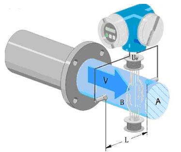 據法拉*電磁感應原理,在與測量管軸線和磁力線相垂直的管壁上安裝了一對檢測電*,當導電液體沿測量管軸線運動時,導電液體切割磁力線產生感應電勢,此感應電勢由兩個檢測電*檢出,數值大小與流速成正比例,其值為:
