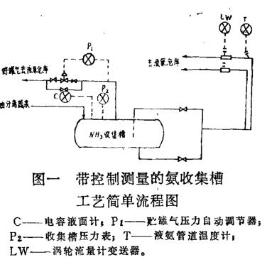 衛生型液體渦輪流量計安裝在氨收集槽液氨管道上,帶控制測量的氨收集槽工藝簡單流程是:當320kg/cm2液氨送入收集槽,降壓到16kg/cm2,氨在收集槽內進行氣液相分離,分離后的貯罐氣送出管路,分離后的液氨,經液氨管道送到液氨倉庫(如‘圖一所示)