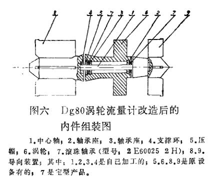 使甩中譯杯料在液氨中發生膨脹,會使渦輪轉速減小,甚至轉不動。以后改為石墨軸.早t。使用甲段時間,由于軸承受滑動摩擦,李乍期高速雄轉下很快磨損,間隙增大,渦羚軸串動,造成計量不準?!,F在釋們改用不銹鋼滾珠軸承,這樣將滑動摩擦改為滾動摩擦,起動轉矩小,轉動靈活。近兩年在每年一度大檢修中,拆下檢查沒有發現什么問題(改制零件的詳細情況見圖二、三、四、五、六)。