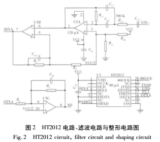 HART協(xié)議通信模塊主要由HART調(diào)制解調(diào)器HT2012和D/A轉(zhuǎn)換器AD421及其外圍電路實(shí)現(xiàn)。HART MODEM采用Smar公司的HT2012,是符合Bell202標(biāo)準(zhǔn)的半雙工調(diào)制解調(diào)器,實(shí)現(xiàn)HART協(xié)議規(guī)定的數(shù)字通信的編碼或譯碼。該芯片專為HART儀器設(shè)計(jì),片內(nèi)集成了符合Bell202標(biāo)準(zhǔn)的調(diào)制器、解調(diào)器、時(shí)鐘及定時(shí)電路、檢測(cè)控制電路,性價(jià)比較高。其中AD421通過串行接口接收現(xiàn)場(chǎng)儀表內(nèi)部MCU傳送的數(shù)字信號(hào),轉(zhuǎn)換成4~20mA電流輸出,輸出主要的測(cè)量結(jié)果。HT2012則從VIN-節(jié)點(diǎn)接收疊加在4~20mA環(huán)路上的信號(hào),對(duì)其帶通濾波和放大之后進(jìn)行載波檢測(cè),如果檢測(cè)到FSK頻移鍵控信號(hào),則將IRXA節(jié)點(diǎn)上的 1.2kHz的信號(hào)解調(diào)為‘1’,將IRXA節(jié)點(diǎn)上的2.2kHz信號(hào)解調(diào)為‘0 ’,并通過串口通信RXD0節(jié)點(diǎn)傳輸給C8051F020,C8051F020接收命令幀并作相應(yīng)的數(shù)據(jù)處理。之后,C8051F020產(chǎn)生要發(fā)回的應(yīng)答幀,應(yīng)答幀的數(shù)字信號(hào)由HT2012調(diào)制成相應(yīng)的1.2kHz和2.2kHz的頻移鍵控(FSK)信號(hào),即節(jié)點(diǎn)TXD0到節(jié)點(diǎn)OTXA的調(diào)制過程,并經(jīng)過發(fā)送信號(hào)整形電路進(jìn)行波形整形后,經(jīng)AD421疊加在環(huán)路上發(fā)送。C8051F020外接1.8432MHz晶振,4分頻后作為HART調(diào)制解調(diào)的時(shí)鐘信號(hào)源,電路圖如圖2所示。