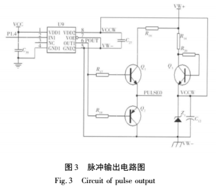 脈沖輸出模塊主要由高速光耦隔離器、穩(wěn)壓電路構(gòu)成。脈沖輸出是采用控制 P1.4口的高低電平翻轉(zhuǎn)來實(shí)現(xiàn)的。考慮到儀表安全性,流量計(jì)的脈沖輸出模塊均需要隔離保護(hù)。選用功耗低的高速CMOS信號(hào)隔離器,一端由AD421的輸出電壓VCC 3V供電,另一端由用戶供電。用戶通常提供DC 12V或DC 24V電源,所以采用穩(wěn)壓管Z1穩(wěn)壓5V給光耦另一端供電,如圖3所示,其中VW+,VW-為用戶提供的外接DC 12V或DC 24V電源輸入端,Q1,Q2為三*管。脈沖輸出時(shí),當(dāng)P1.4為高電平,POUT為高電平,Q1導(dǎo)通,Q2截止,節(jié)點(diǎn)PLUSEO輸出高電平;當(dāng)P1.4為低電平,POUT為低電平,Q1截止,Q2導(dǎo)通,節(jié)點(diǎn)PLUSEO輸出低電平。