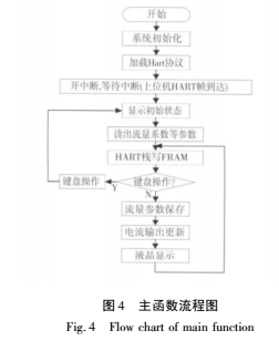HART通信協(xié)議采用問答式,即上位機(jī)(主機(jī))向下位機(jī)發(fā)出命令,下位機(jī)(從機(jī))回答。主機(jī)消息到來時(shí),通過觸發(fā)串口中斷來接收和發(fā)送數(shù)據(jù)。主循環(huán)程序還包括檢測(cè)溫度并送LCD顯示的子程序模塊,4~20mA電流輸出子程序模塊,累計(jì)流量寫鐵電子程序模塊等。系統(tǒng)主函數(shù)流程圖如圖4所示,脈沖采集、脈沖輸出流程圖如圖5所示。