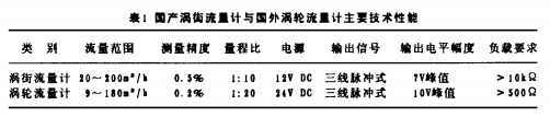 電池供電渦輪流量計(jì)與國外渦輪流量計(jì)的主要技術(shù)性能如表l所示。表1中為采用公稱直徑為100的傳感器測量范圍。
