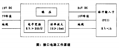 a、將計(jì)算機(jī)輸入卡提供的24V DC電源轉(zhuǎn)換成渦街流量計(jì)所需要的12V DC電源。此功能由穩(wěn)壓電路完成,并具有短路限流保護(hù)。