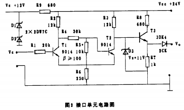 調(diào)試時(shí),先將接口單元的輸出端接1k電阻,然后將輸入端接1.5V電壓,逐步減小電阻R5的值,直至輸出端電壓上升到10V;若不能達(dá)到此值,則可能是三*管T3的直流放大倍數(shù)過低。逐步降低輸入端的電壓直至1.2V,此時(shí)輸出端應(yīng)為零。若不能可靠地回零,則可能是電阻R5的值過小。