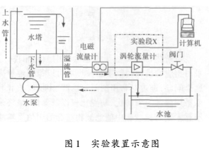 本實驗利用標準表法對渦輪流量計進行檢定,水泵連續將水池里的水送入高位水塔,水塔通過溢流來保持水壓恒定,實驗時,水從水塔的下水管依次流過標準表電磁流量計、被檢表渦輪流量計,*后回到水池。實驗利用計算機對電磁流量計、渦輪流量計的輸出信號進行實時采集與處理。液體流量標準裝置DN100管線流量測量范圍為20~200m3/h,精度可達0.2%。但由于加上阻流件以及被校表后造成管道壓力損失增大,流量范圍將會有所減小,本實驗流量范圍是20~145m3/h。