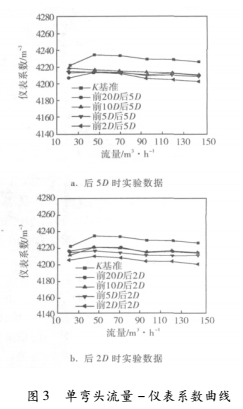 b.后直管段長度對測量的影響:當前直管段較長時,后直管段對儀表系數的影響不大;隨著前直管段逐漸縮短到2D時,后直管段越短造成平均儀表系數的偏差越大。