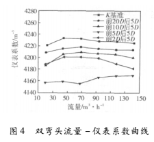 a.在雙彎頭的各工況中,前20D儀表系數隨流量的增加變化平緩,前10D和前5D有明顯上升趨勢,前2D有明顯下降趨勢,說明前10D、5D、2D的線性度較前20D的差。